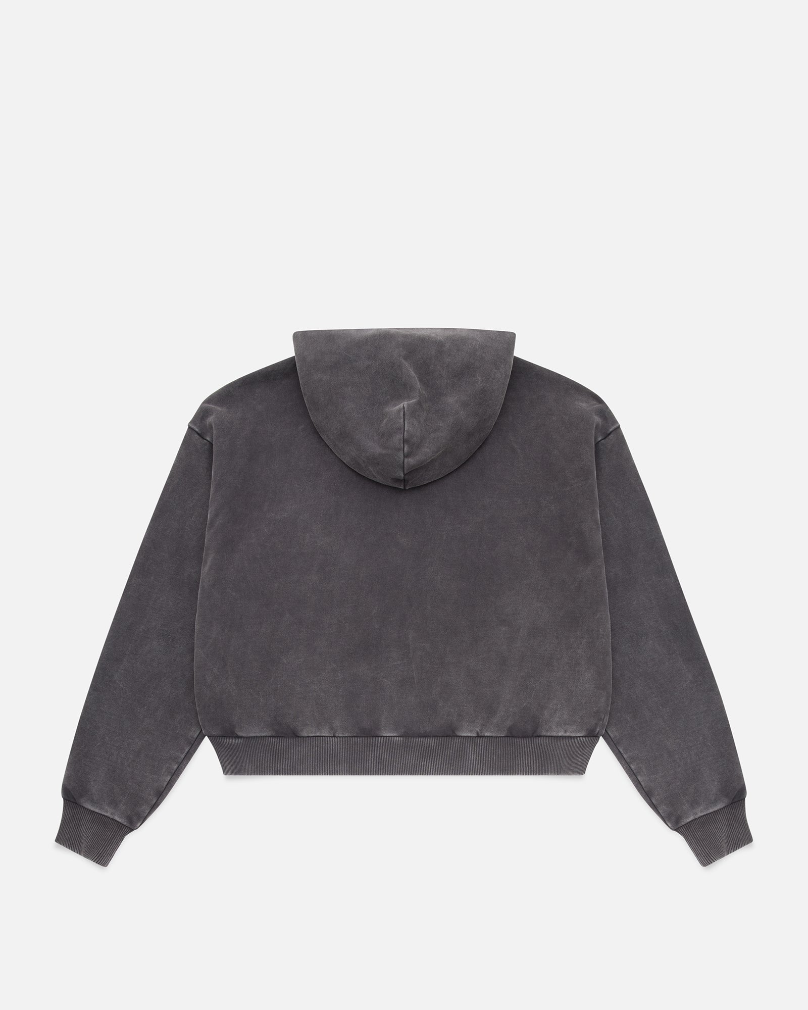 Made with our 460gsm 100% cotton french terry fabric, with an acid wash treatment. This zip-up hoodie features a cropped fit, boxy silhouette, slit pockets, double metal zips, and a double layered hood.