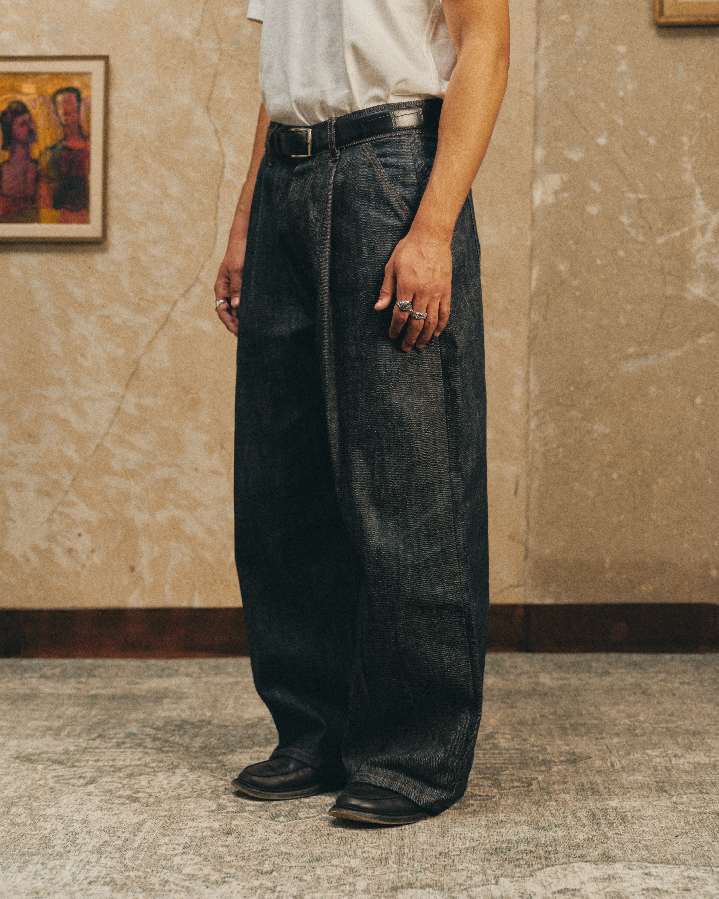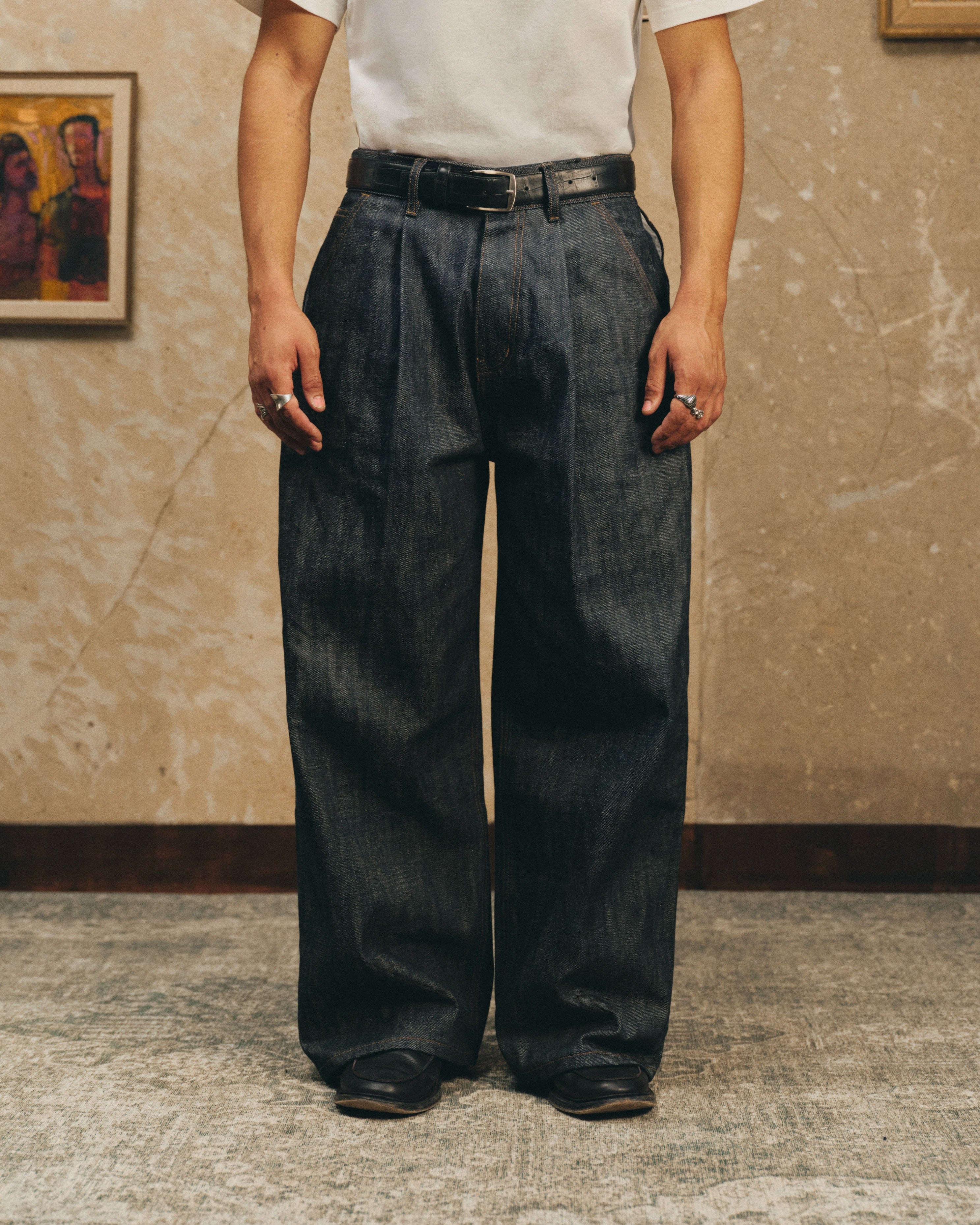 Made with 14.5oz raw denim. The fabric features an all-white selvedge ID. 100% pure twill cotton. Split Y pockets (seperate your phone from your keys). Brown contrast stitching. Double pleats and a wide-leg fit. Custom Colour Plane alloy button hardware. YKK fly zipper. Custom debossed leather jacron label on back right waist.